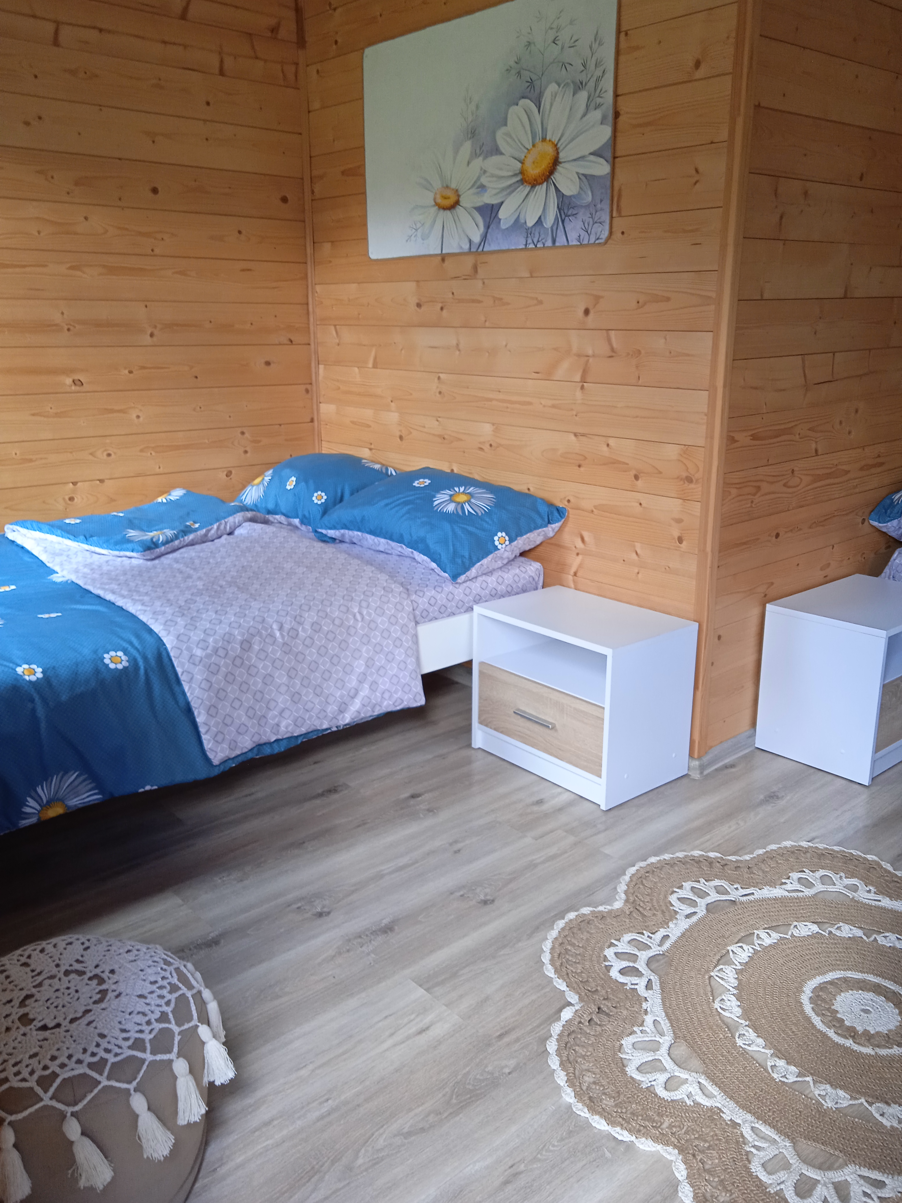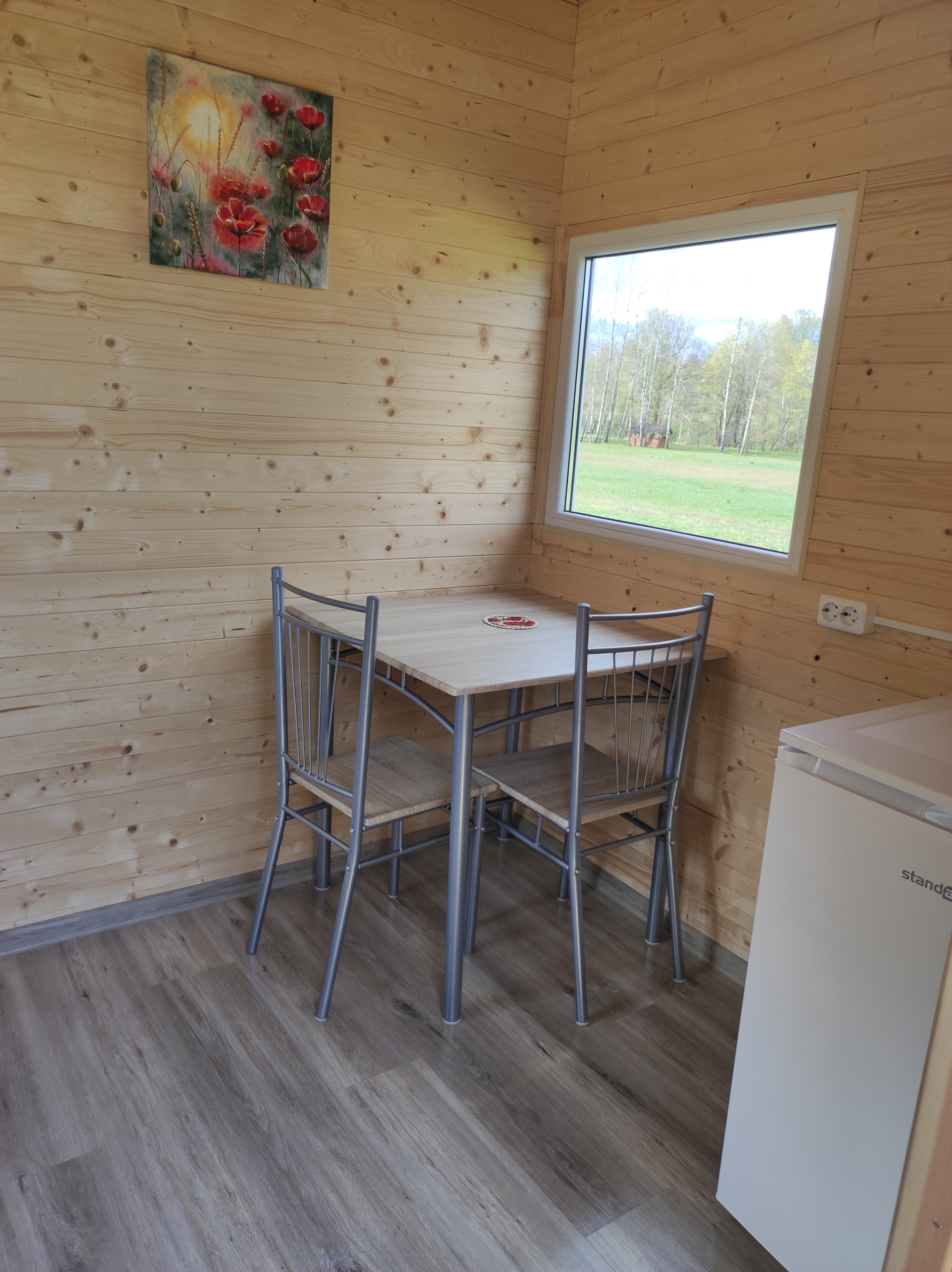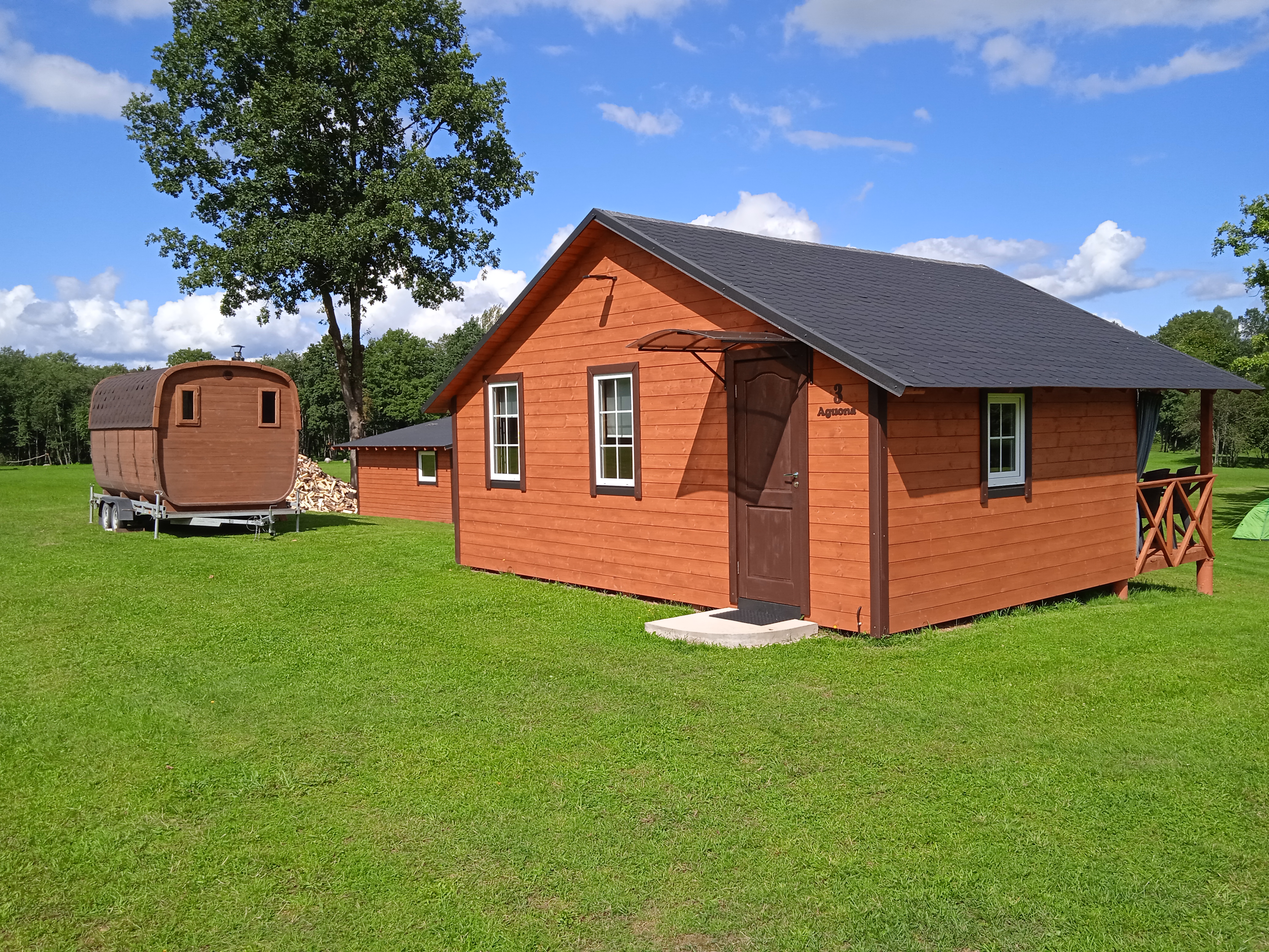 Aštuonviečiame namelyje du keturviečiai kambariai. Yra terasa su lauko baldais. Prie namelių yra virtuvėlė, tuoletai, dušas.
